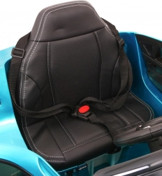 Bezpečnost je na prvním místě: vícebodové bezpečnostní pásy, dálkové ovládání 2,4 GHz se STOP tlačítkem, zamykání dveří a dobře čitelné LED osvětlení vpředu i vzadu. Interiér nabízí černé sedadlo z ekokůže s plynulým posuvem vpřed/vzad a přehledný kokpit se startovacím tlačítkem s efektem zvuku motoru.