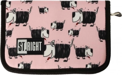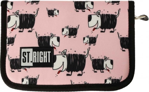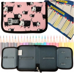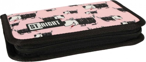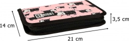 Praktický školní penál s dvěma chlopněmi v růžovém designu se psi. Nabízí přehledné uspořádání školních potřeb, je uzavíratelný na zip a má ergonomické poutko jezdce. Uvnitř najdete přepážky a pružná uchycení pro fixy, tužky i pravítko, součástí je také tabulka násobků a rozvrh hodin.