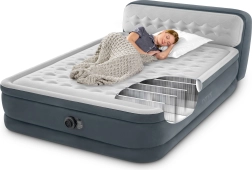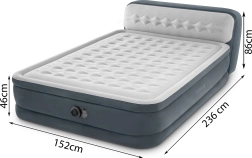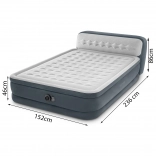 Vestavěná elektrická pumpa umožňuje rychlé a bezpracné nafouknutí i vyfouknutí. Příjemný velurový povrch je šetrný k pokožce a zlepšuje přilnavost prostěradla. Integrované nafukovací čelo poskytuje oporu při čtení a odpočinku. Postel je dodávána s přepravní taškou a opravnou záplatou.