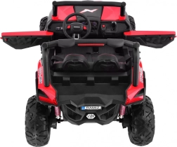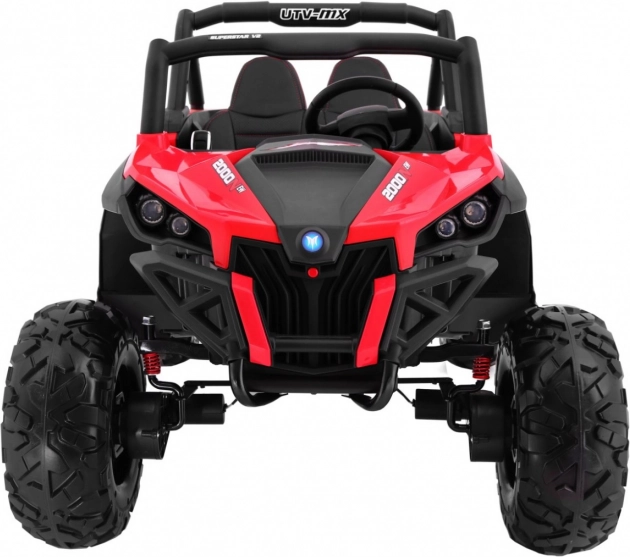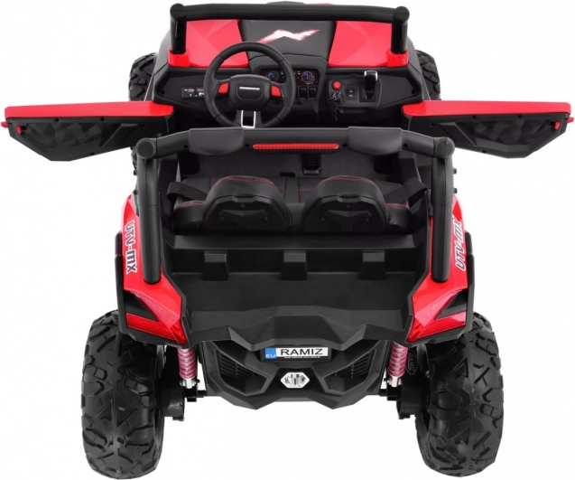 Interiér potěší větraným sedadlem z eko kůže s bezpečnostními pásy, realistickým startem na klíček a otevíracími dveřmi s blokádou. Bohatý multimediální panel nabídne MP3, USB, SD, AUX, Bluetooth, FM rádio i zvuky na volantu. Rodiče ocení dálkové ovládání 2,4 GHz se třemi rychlostmi a nouzovým STOP. Praktický zadní úložný box a LED osvětlení vpředu i vzadu dotvářejí špičkovou výbavu.