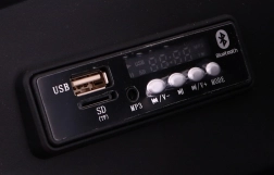 - Zábava a viditelnost: LED světla, audio panel (MP3/USB/SD/BT/FM), ukazatel nabití.