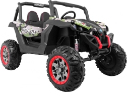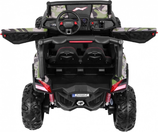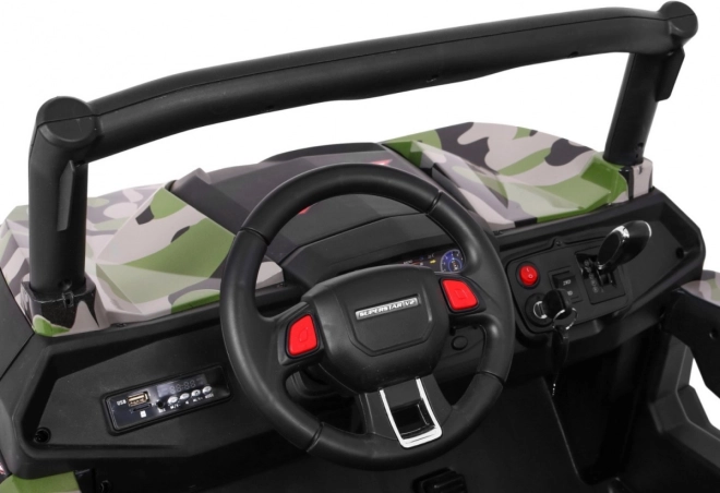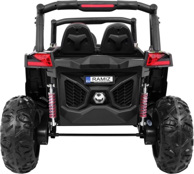 Multimediální panel nabídne MP3, USB, SD, AUX, Bluetooth, FM rádio i předinstalované melodie. Nechybí start na klíček, indikátor nabití, zvuky na volantu a LED světla s vypínačem. O bezpečí se starají bezpečnostní pásy a rodičovský ovladač 2,4 GHz se třemi rychlostmi a tlačítkem STOP.