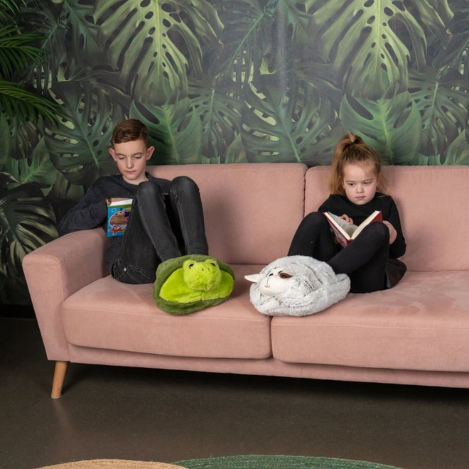 Obří domácí pantofel ve tvaru želvy je navržen pro maximální komfort při sezení a ležení. Díky super měkké výplni a útulnému vnitřku udržuje nohy v teple bez elektriky a bez rizika popálení. Je ideální pro sledování televize, čtení, hraní her či práci na notebooku.