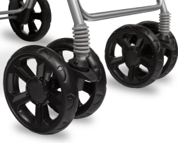 Odolná EVA kola s měkkým odpružením předních kol tlumí vibrace. Aretrace pro jízdu rovně pomáhá na dlažbě a nerovnostech.