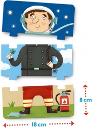 Objevte svět profesí hravou formou! Třídílné skládačky můžete mezi sebou libovolně kombinovat a vytvářet tak zábavné postavičky – od astronauta až po kominíka. Velké, pevné dílky se snadno drží i nejmenším dětem a podporují jejich kreativitu i logické uvažování.