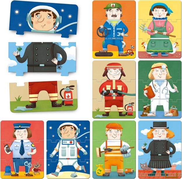 Sada obsahuje celkem 24 dílků, ze kterých vznikají třídílné kombinace. Děti si při skládání nenásilně procvičí koncentraci, jemnou motoriku a naučí se více o různých povoláních. Ilustrace od autorky Piny Gertenbach dodávají puzzle jemný, hravý styl.