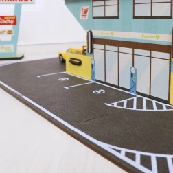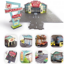 Supermarket s burger restaurací, parkovištěm a značením vytváří věrnou scénu, která děti vtáhne do hry a rozvíjí jejich představivost.