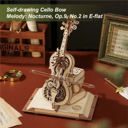 Elegantní model violoncella na podstavci ze tří knih vyniká romantickým, retro vzhledem a klasickými evropskými vzory. Precizně vyřezané díly ze dřeva a kovu do sebe přesně zapadají a po natažení se rozezní slavná melodie Nocturno, Op. 9 č. 2 (Es dur), zatímco smyčec se plynule pohybuje tam a zpět. Výsledkem je okouzlující spojení hudby a mechaniky, které vynikne v každém interiéru.