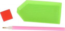 Zelený tácek pro třídění kamínků, růžové pero a vosk umožňují rychlé a přesné nabírání a pokládání kamínků bez zbytečného nepořádku.