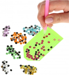 - 12× samolepková šablona, kamínky v 7 barvách, lepidlo (vosk), plastový tácek, aplikátor – pero