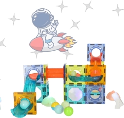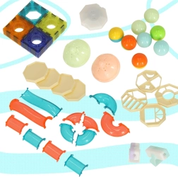 Sada nabízí univerzální stavění ve 2D i 3D: od jednoduchých tvarů až po komplexní dráhy. Magnetické čtverce zajistí stabilní konstrukci, zatímco trubky a tunely se vkládají snadno „na zacvaknutí“. Díky svítícím dílům a kuličkám se každý sjezd mění v zábavné, vizuálně poutavé představení.