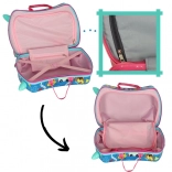 Uvnitř najdete 2 velké oddíly – jeden uzavíratelný na zip a druhý s křížovými popruhy pro fixaci věcí – plus malou kapsu na zip na drobnosti. Kufr má oboustranný zip, praktická držadla a opěrky na nohy pro pohodlné sezení. Děti si s vlastním kufrem budují návyk pečovat o své věci a učí se samostatně balit.