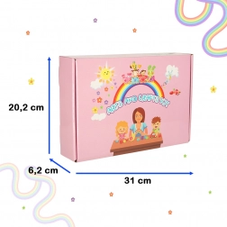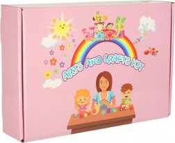 Obsah balení zahrnuje mimo jiné: chlupaté a třpytivé drátky, dřevěné špachtle, barevné papírky, sady samolepek, pohyblivá a barevná očka, pompony, peříčka, korálky včetně písmen, plastovou šňůrku na navlékání i bezpečné nůžky. Vše je uloženo v pěkné růžové krabici, která je ideální i jako dárek.
