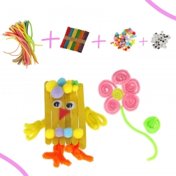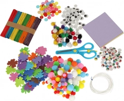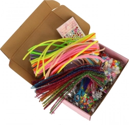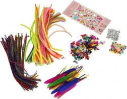 Kompletní set materiálů od drátků a pomponů po samolepky a korálky umožní dětem vytvářet rozmanité projekty bez nutnosti dokupovat další pomůcky.