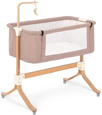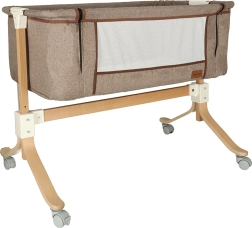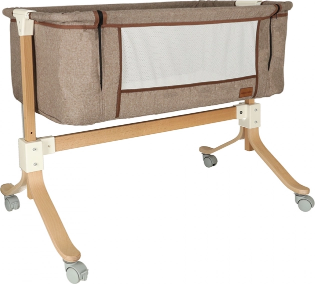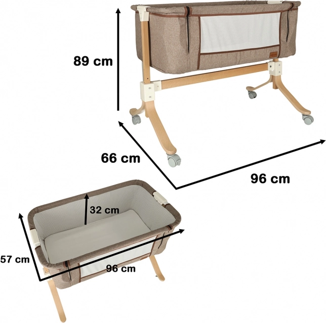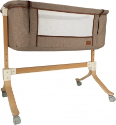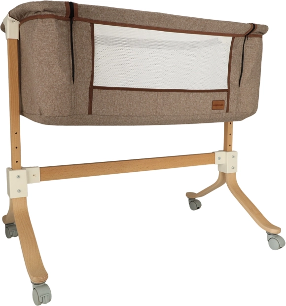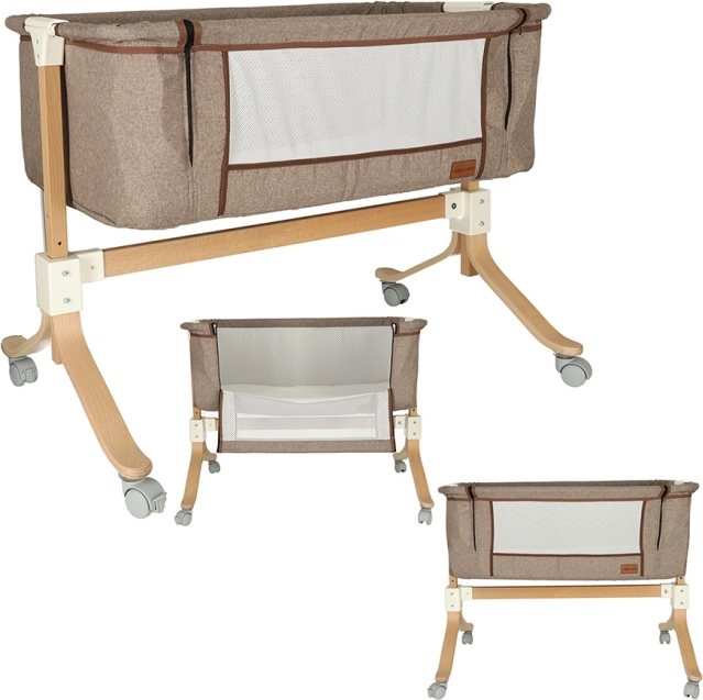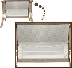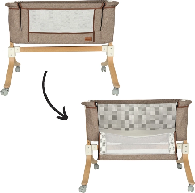 Se svým elegantním designem, dřevěným rámem a hnědými tkaninami se postýlka hodí do každého interiéru. Díky možnosti odstranění boční stěny pomocí zipu je postýlka snadno přístupná a její funkce dostavníku je uživatelsky přívětivá.