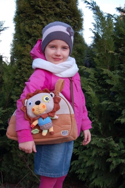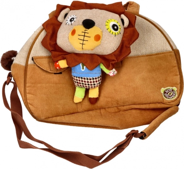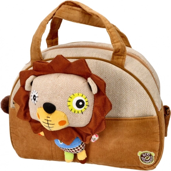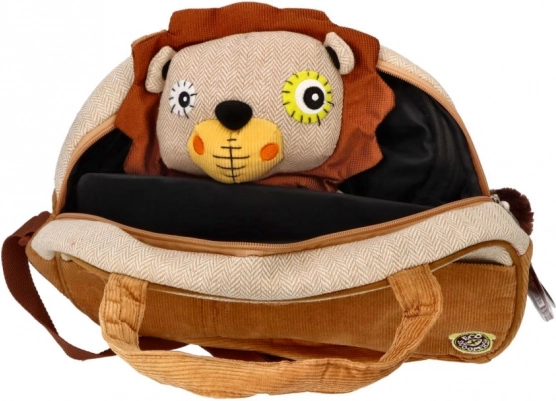 Plyšová hračka ve tvaru lva, která je součástí tašky, poskytuje dětem zábavu i útulnost.
