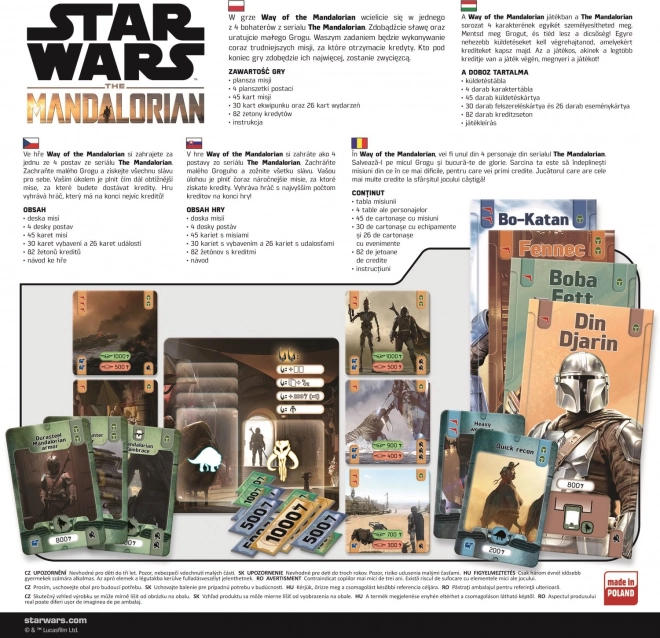 V této deskové hře se ponoříte do světa Star Wars a stanete se jednou ze čtyř postav z oblíbeného seriálu The Mandalorian. Vaším hlavním cílem je splnit náročné mise, získat kredity a zachránit Grogu. Každý úkol, který dokončíte, vám přináší další kredity, a na konci hry vítězí ten, kdo nasbíral nejvíc.