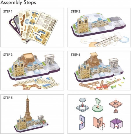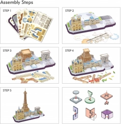 Tato stavebnice ze série CityLine od značky CUBICFUN přináší detailní 3D model vybraných pařížských symbolů, jako je Eiffelova věž, Arc de Triomphe a katedrála Notre-Dame. Díly jsou vyrobeny ze speciální pěny o tloušťce přibližně 3 mm potažené laminovaným potištěným papírem, díky čemuž je model pevný, lehký a vizuálně působivý.