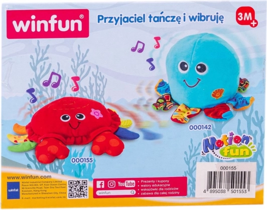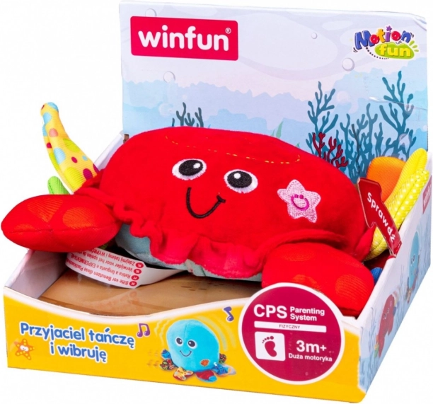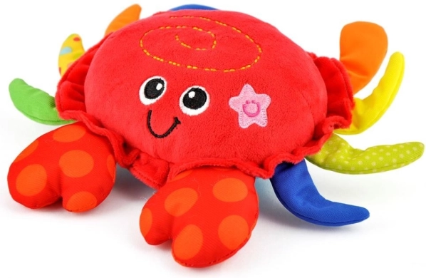 Roztomilý krab, který tančí, vibruje a „utíká“, motivuje děti k plazení a prvním krůčkům. Hračka je měkoučká a bezpečná, vydává veselé zvuky a hraje melodie, čímž podporuje motoriku, koordinaci oko–ruka a rozvoj zraku už od 3 měsíců.