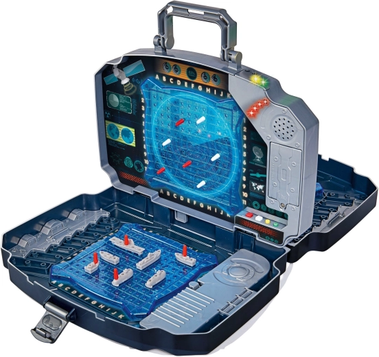 Přenositelná elektronická hra Námořní bitva v odolném kufříku s dvojicí modrých herních mřížek, úložnými přihrádkami a efekty světla a zvuku. Nabízí 2 hráče, snadné sledování zásahů pomocí červených a bílých kolíků a intuitivní ovládání pro děti od 5 let. Ideální na doma i na cesty.