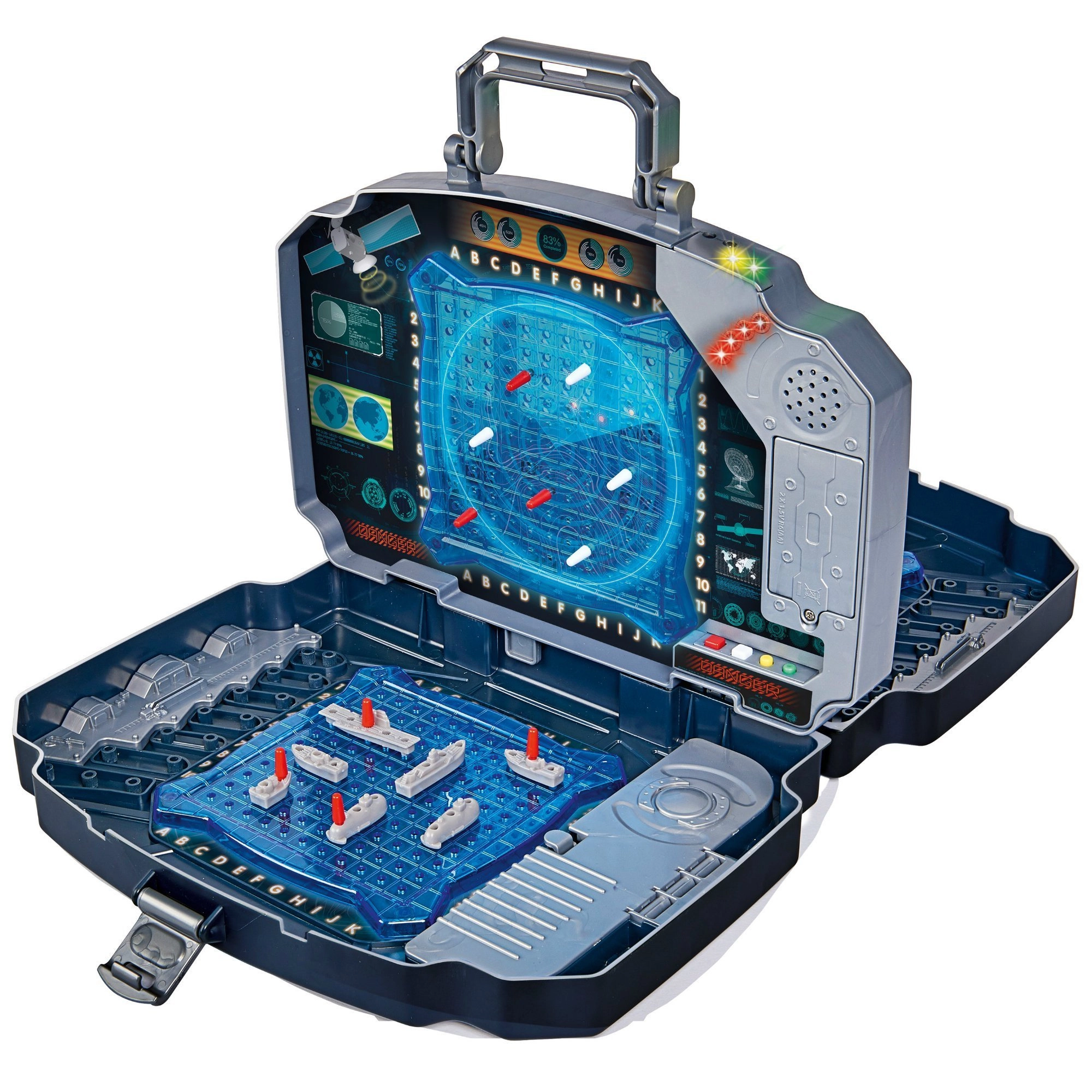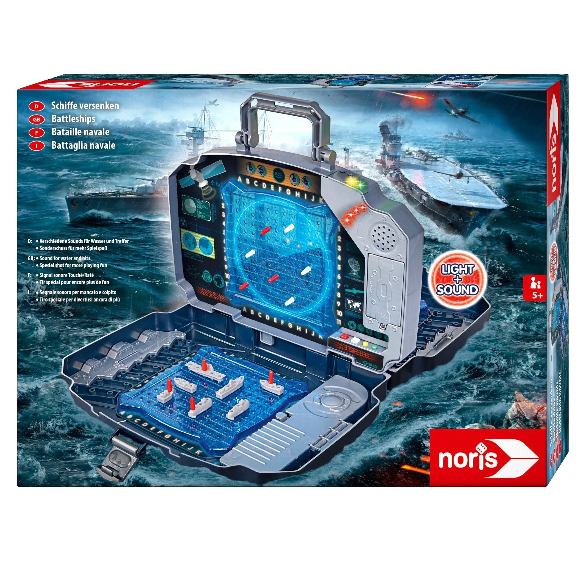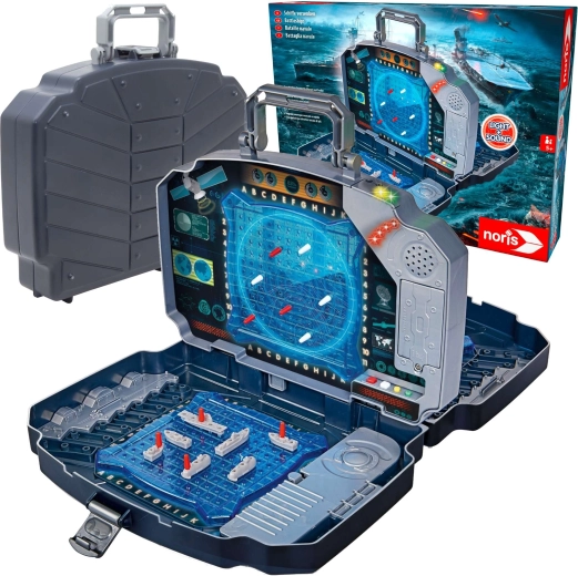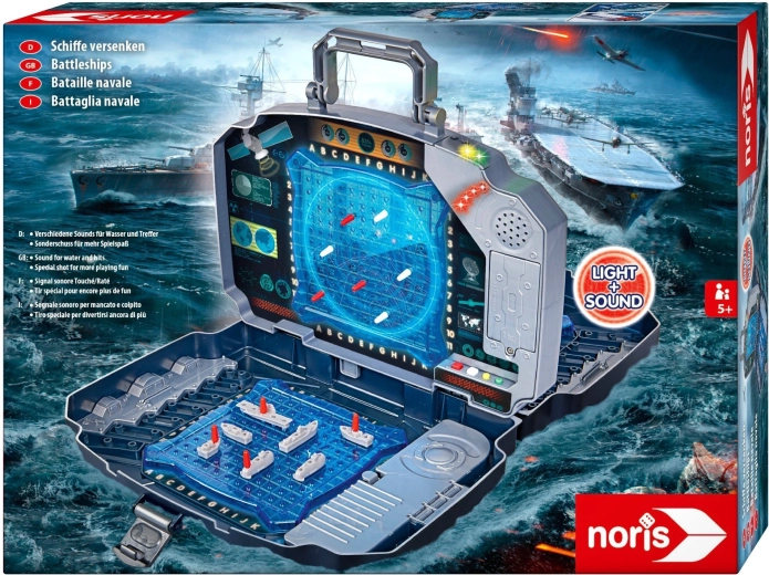 Užijte si klasickou hru Námořní bitva v moderním provedení. Pevný grafitový kufřík ukrývá dvě modré hrací mřížky pro rozmístění lodí a středový panel pro označování střel na soupeře. Integrované světelné a zvukové efekty jasně oznámí zásah i minutí – hra je tak přehledná, napínavá a zábavná pro celou rodinu.