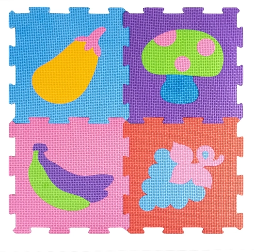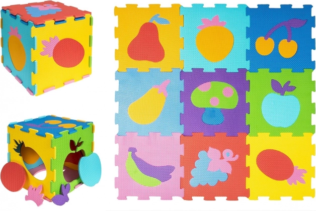 Barevná dětská podložka z měkké pěny slouží jako pohodlný kobereček i zábavné puzzle. Podporuje rozvoj motoriky, učení barev a tvarů a prostorové myšlení. Díly lze skládat na podlahu nebo z nich vytvářet 3D tvary, jako jsou kostky či malé stolky. Příjemný, neklouzavý povrch a hravé motivy ovoce zajistí bezpečné a podnětné hraní.