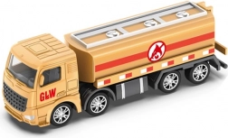 Bežový cisternový kamion s válcovou nádrží, červenými pruhy a logem nabízí plynulý pohyb díky volně se otáčejícím kolům. Ideální pro hraní na přepravu kapalin a rozšíření „dopravního světa“ dětí.