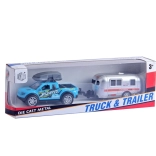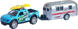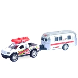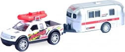 SUV s tažným zařízením a kempovacím přívěsem, volně se otáčející kola a povedené potisky pro autentický zážitek.