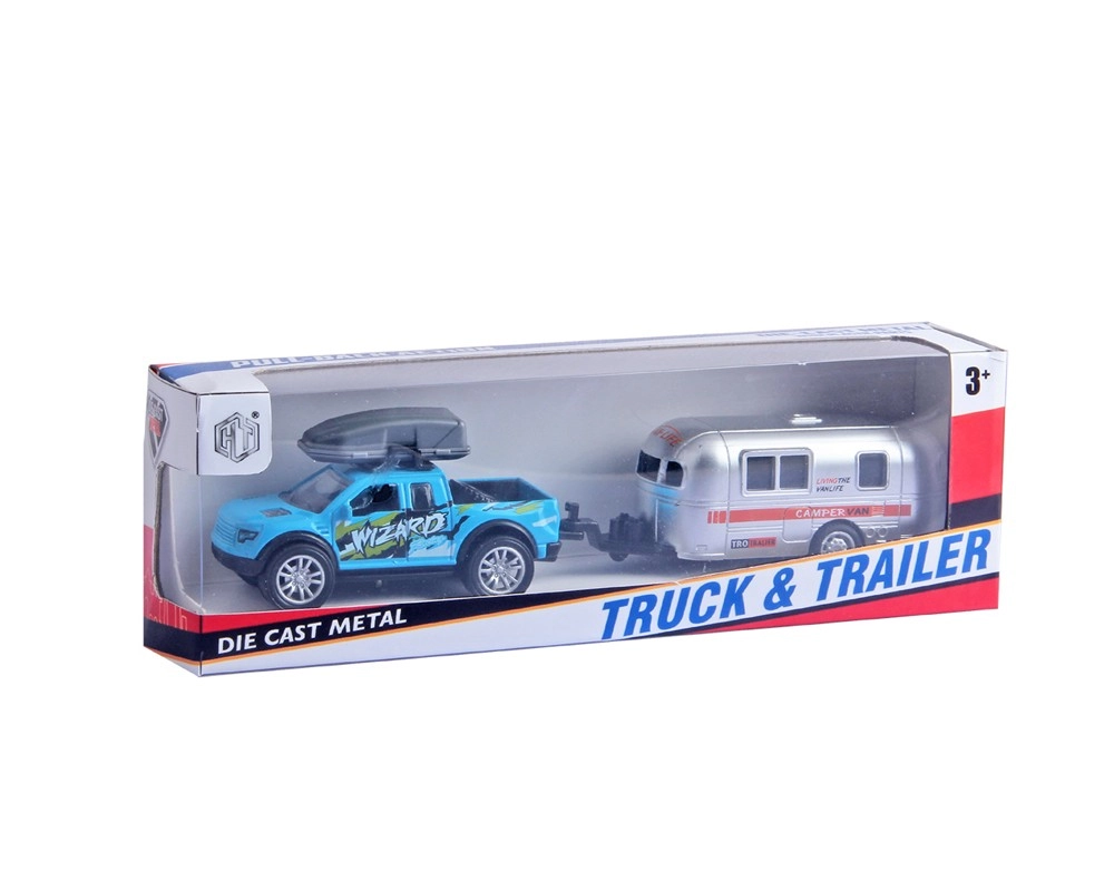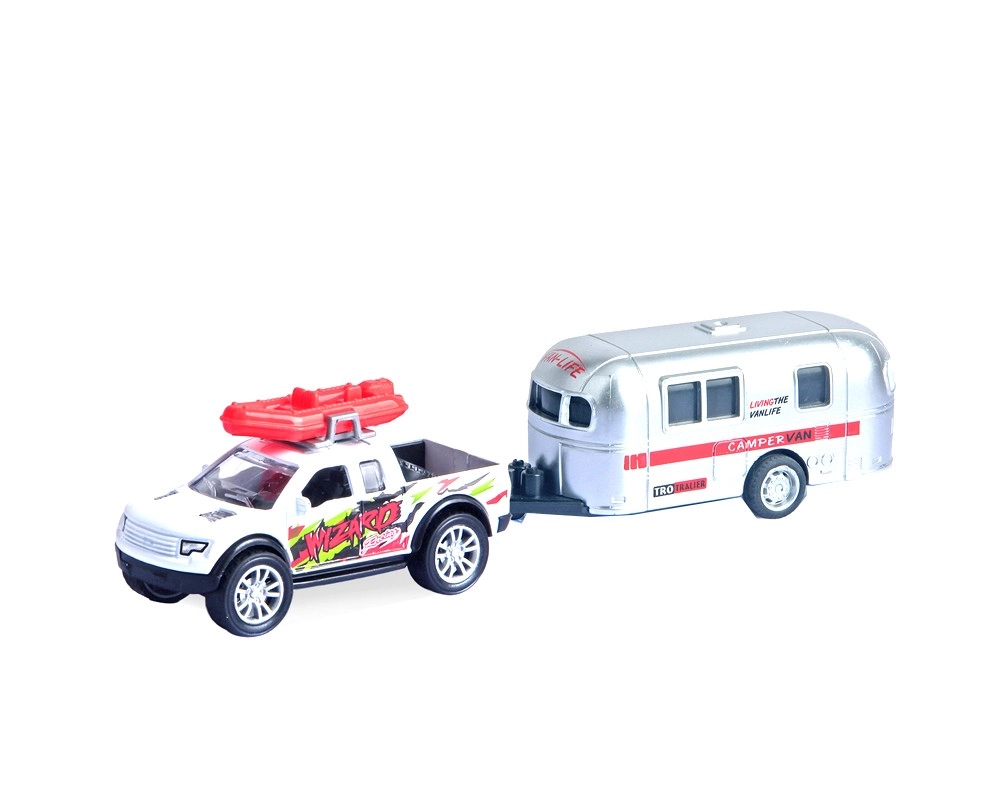Objevte stylovou sadu, kde robustní vůz táhne detailně zpracovaný přívěs. Kovové provedení zajišťuje odolnost a dlouhou životnost, otevírací dveře lákají k prozkoumání interiéru a mechanický pull back postará se o dynamickou jízdu bez baterií.
