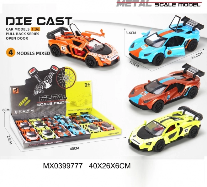 Užijte si rychlou zábavu s kovovým závodním autíčkem v měřítku 1:36. Model nabízí otevírací dveře, kvalitní kovové zpracování a oblíbenou funkci pull back – natáhni a jeď. K dispozici jsou 4 atraktivní designy pro ještě více zábavy a sběratelského nadšení.