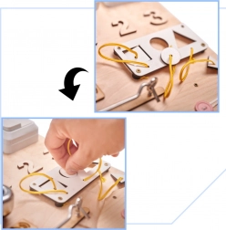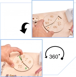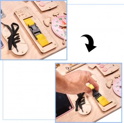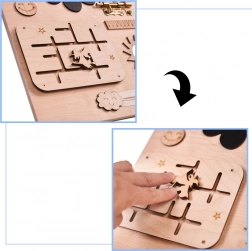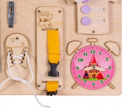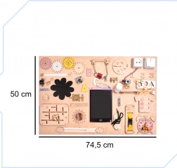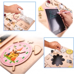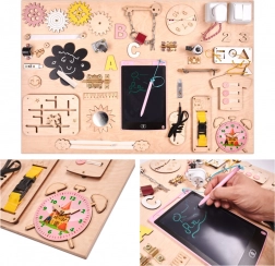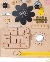 Součástí je pestrá paleta aktivit: elektronický znikopis s perem, barevná ozubená kola, zip, cyklistický zvonek, různé typy západek a háčků, šněrovací bota, košile s knoflíky, dřevěná čísla a písmena, kolečko s čísly, labyrint s pohyblivým žralokem, tabulka na křídu ve tvaru lodi, měřítko, vypínač světla, zásuvka s vidlicí, suchý zip, bezpečné zrcátko v raketě, zámek s klíčky a popruh s přezkou.