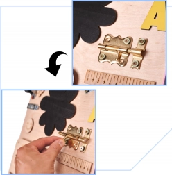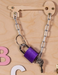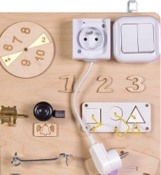 Vypínač světla, zásuvka s vidlicí, zámky a západky učí děti příčinu a následek i praktické dovednosti v bezpečném provedení.