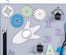 - Bohatá výbava: barevná ozubená kolečka, zip, zvonek, dva typy zástrček/posuvných západek, bota se šňůrkou pro nácvik vázání, dřevěná čísla a písmena, otočná kolečka, suchý zip, dráha s posuvným autíčkem, tabulka ve tvaru autobusu pro psaní křídou, háček, nerozbitné zrcátko v raketě, hodiny s pohyblivými ručičkami, tříprvkový tvarový sorter, pravítko a vypínač světla.