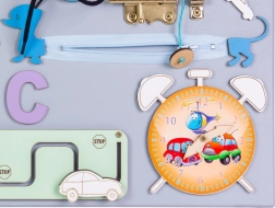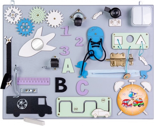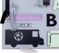- ozubená kolečka, zip, zvonek, zástrčky/západky, bota se šněrováním, dřevěná čísla a písmena, otočná kolečka, suchý zip, dráha s autíčkem, tabulka pro křídu, háček, zrcátko, hodiny s ručičkami, tvarový sorter (3 tvary), pravítko, vypínač