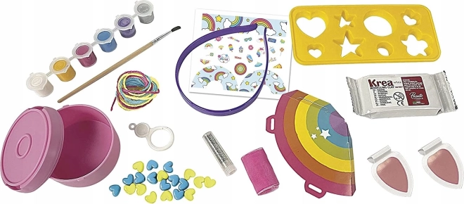 Kreativní sada k výrobě čtyř doplňků v barvách duhy. Nechte své děti popustit uzdu fantazii s modelovací hmotou, temperovými barvami, vlnou a dalším materiálem.