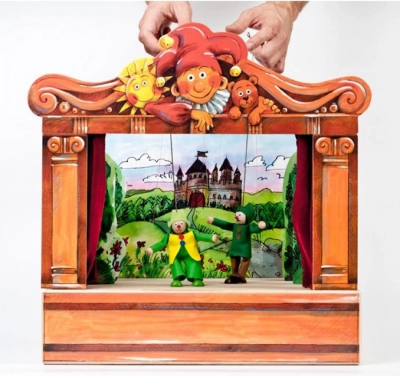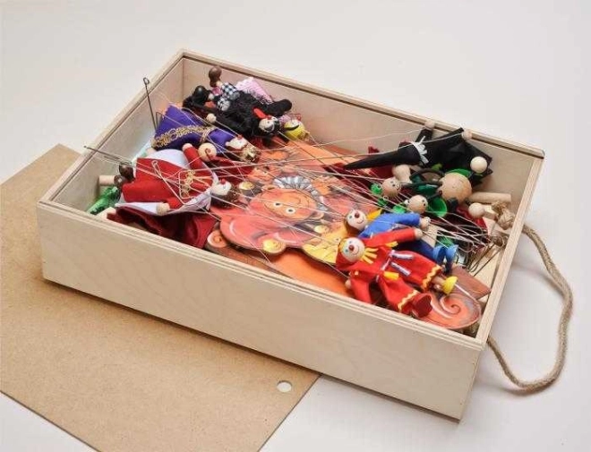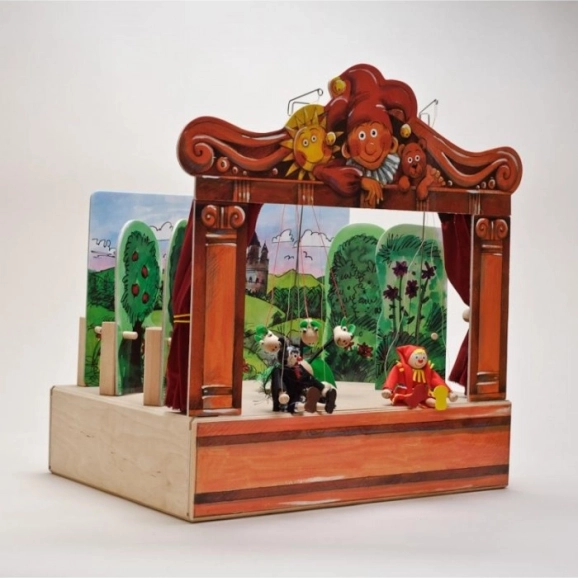 Dřevěné divadlo s 2 oboustrannými kulisami a 8 loutkami. Ručně vyráběné loutky s možností rozšíření o další loutky a kulisy.