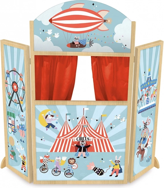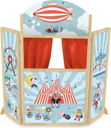 Vstupte do světa fantazie s Vilac cirkusovým loutkovým divadlem. Tento krásně ilustrovaný herní set od Michelle Carlslund, oblíbené dánské ilustrátorky, je navržen pro podporu kreativity, řeči a představivosti dětí. Divadlo je vybaveno pestrobarevnými grafickými panely s cirkusovou tematikou a červenými závěsy, které poskytují dokonalé prostředí pro loutkové představení a vyprávění příběhů.