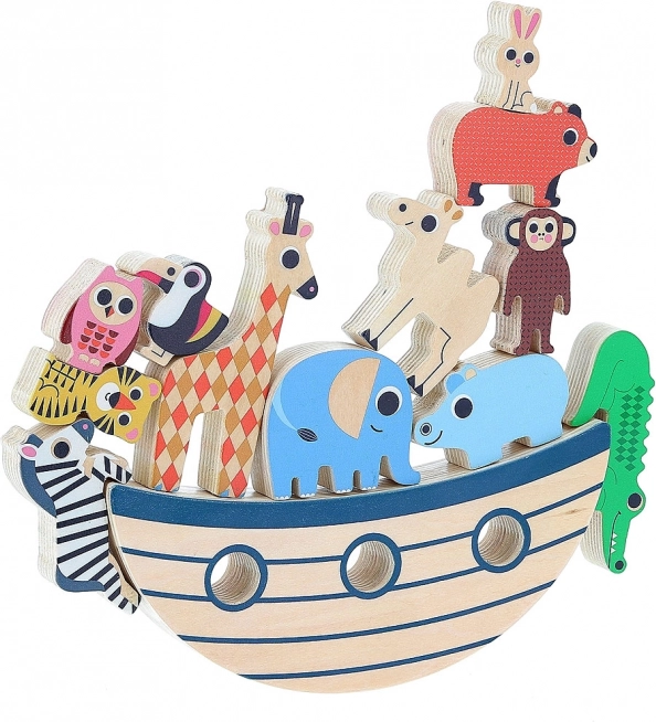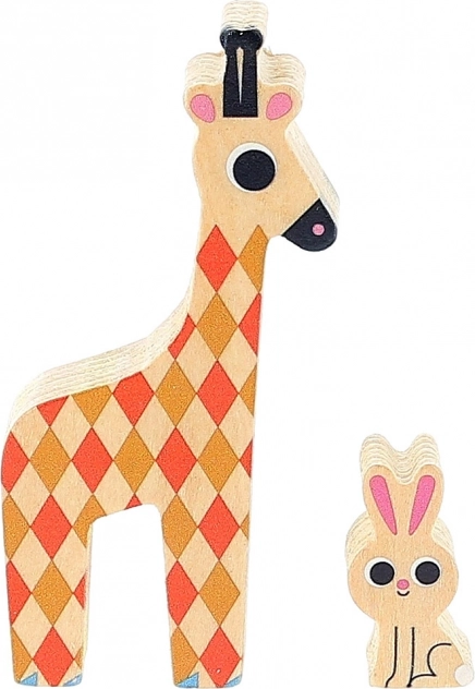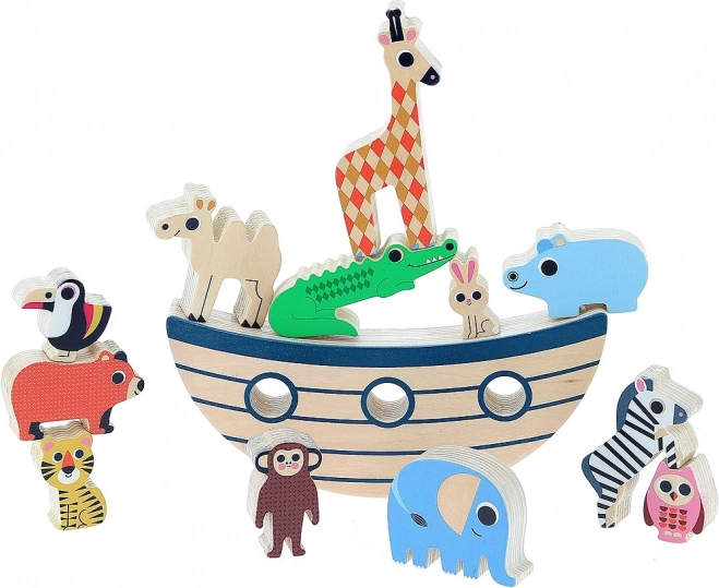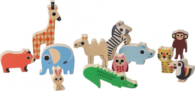 Hra obsahuje pestrou kolekci 12 dřevěných zvířátek, které děti mohou stohovat a vyvažovat na základně.