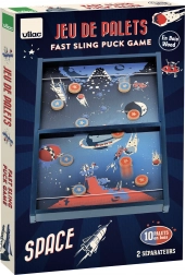 Objevte zábavnou dřevěnou stolní hru VILAC ve vesmírném stylu, která rozvíjí postřeh, přesnost a jemnou motoriku. Pomocí gumičky vystřelujte puky a dostaňte je skrz jediný otvor uprostřed – nebo zvyšte výzvu výměnnou vložkou se dvěma otvory. Skvělá rodinná zábava a originální retro vzhled pro malé i velké hráče. Od 4 let, kvalitní dřevěné provedení, rychlá akční hra na každý stůl.