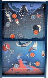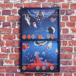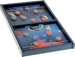 Díky výměnnému středu si snadno zvolíte obtížnost: klasický jeden centrální otvor pro trénink přesnosti, nebo náročnější deska se dvěma mimostředovými otvory pro zkušené střelce. Robustní dřevěná konstrukce, plynulý skluz puků a retro vesmírní grafika zaručují dlouhotrvající zábavu i stylový vzhled herní plochy.