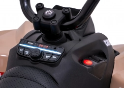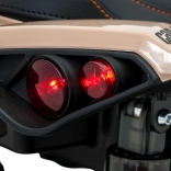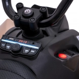 Malí jezdci ocení realistické LED osvětlení vpředu i vzadu, snadné ovládání vpřed/vzad a bezpečný plynulý start. Ergonomické sedlo z černé ekokůže (40 × 23 cm) pohodlně podrží i při delší jízdě. Multimediální panel přehraje oblíbené písničky přes Bluetooth, USB, MP3, AUX a nabízí i FM rádio. Samozřejmostí je ukazatel nabití, startovací zvuky motoru a zadní transportní madlo.