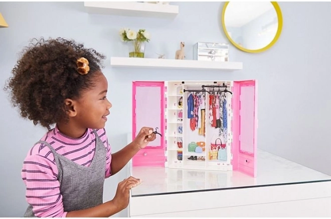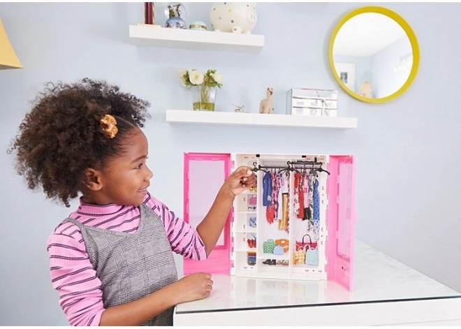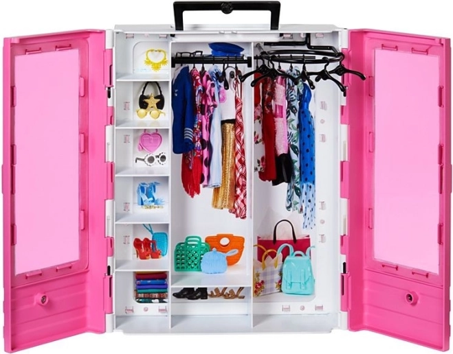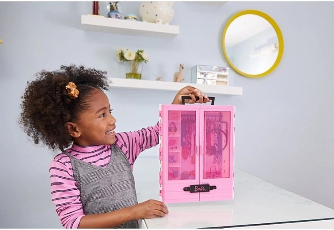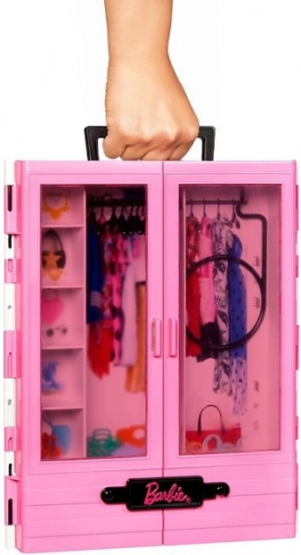 Vstupte přímo do světa módy! Tato skříň na oblečení Barbie má držadlo, takže se snadno přenáší. Světle růžová šatní skříň, navržená v charakteristickém stylu Barbie, má dvojitá průhledná dvířka, která ti umožní nahlédnout dovnitř. Šest připevněných ramínek pomáhá udržovat pořádek, zatímco četné police poskytují ideální místo pro uložení doplňků. Výsuvné velké kulaté ramínko zpestří hru na oblékání. Díky praktické rukojeti lze přenosnou šatní skříň vzít kamkoli s sebou. Když si holčička hraje s Barbie, může být čímkoli chce! Přenosná skříň a šest ramínek jsou součástí balení; panenka se prodává samostatně. Barvy a dekorativní prvky se mohou lišit.