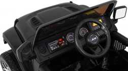 O komfort se starají bezúdržbová EVA kola 29×11,5 cm a zadní odpružení. Sedadlo z ekokůže s bezpečnostním pásem drží dítě jistě na místě. Rodiče ocení dálkový ovladač 2,4 GHz se třemi rychlostmi a bezpečnostním tlačítkem STOP, které v případě potřeby auto okamžitě zastaví.