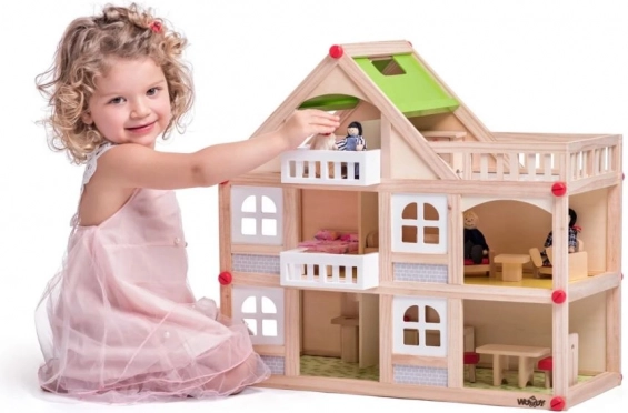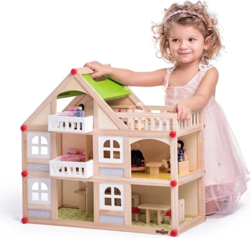 Tento dvoupatrový domeček pro panenky z přírodního dřeva překvapí promyšleným členěním místností, balkony a terasou. Otevřená přední strana usnadňuje hraní i více dětem najednou a podporuje společenskou interakci. Kvalitní zpracování a odolné materiály zaručují dlouhou životnost.