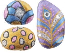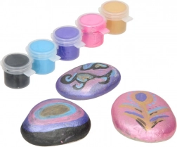 Sada obsahuje 3 přírodní kameny, štětec, 5 kelímků barev, lepidlo, třpytky a zdobicí kamínky – můžete začít tvořit ihned.