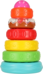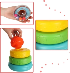 Tato stabilní a bezpečná senzorická věž přináší dětem první radost z učení hrou. Kroužky v různých velikostech, barvách a texturách podporují jemnou motoriku, koordinaci oko–ruka a rozlišování barev. Jeden z kroužků má průhlednou horní část s korálky, které chrastí, čímž stimuluje také sluch.
