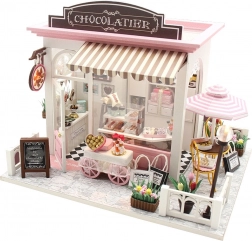 Čokoládovna v jemných růžovo-bílých tónech působí jako malý výkladní prostor s vitrínami plnými „dobrot“, stylovou markýzou a roztomilým posezením. Hotový model krásně vynikne na poličce a stane se originálním dárkem pro kreativní duše od 14 let.