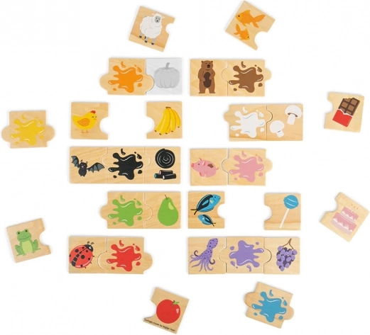 Objevte chytře navrženou vzdělávací hru, v níž děti skládají trojice podle barvy – například hnědý medvěd, čokoládová tyčinka a hnědá kaňka. 30 robustních dřevěných dílků v 10 výrazných barvách láká k opakovanému hraní a přirozeně podporuje učení barev i pojmenovávání objektů.