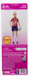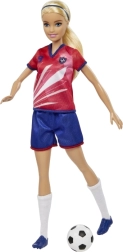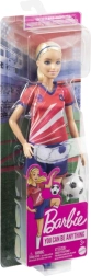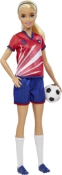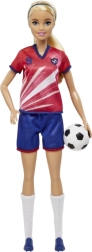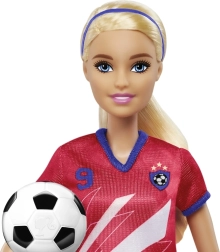 Panenka Barbie fotbalistka inspiruje děti k aktivnímu a nápaditému hraní. Má dlouhé blond vlasy stažené do culíku, červený dres s bílými pruhy a číslem 9, týmovou nášivku, modré šortky, kopačky a vysoké bílé ponožky. Spolu s přiloženým míčem je připravena na trénink i velký zápas.