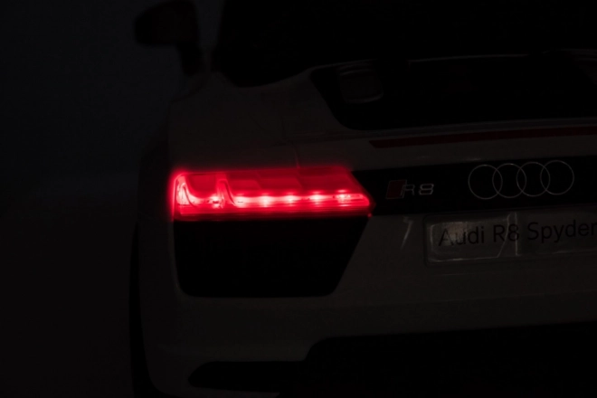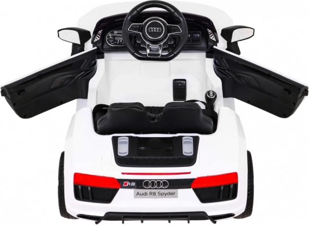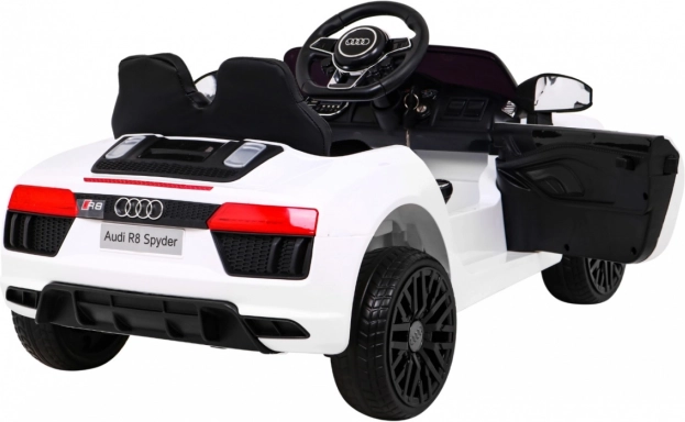 LED světla vpředu i vzadu, panel MP3/USB/SD/AUX a tlačítka na volantu. Otevírací dveře a autentické prvky vozu AUDI R8 potěší každé dítě.